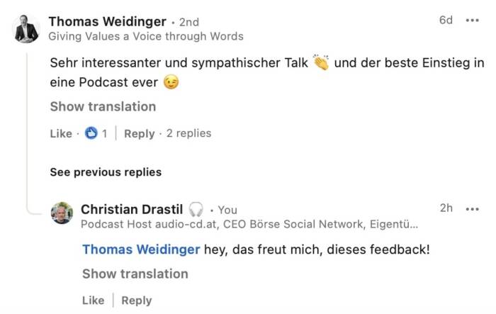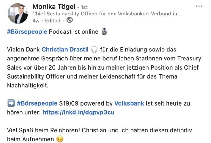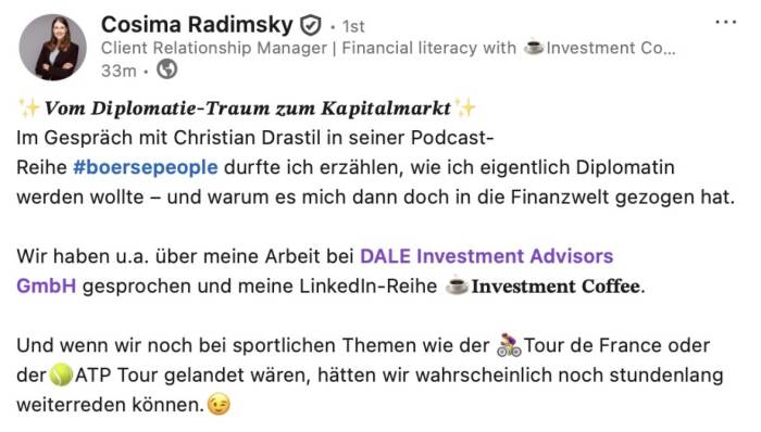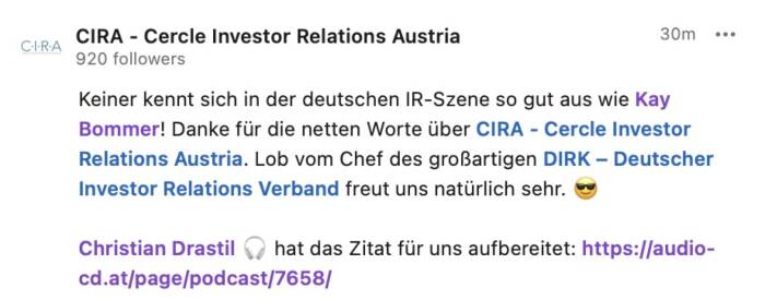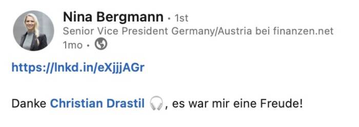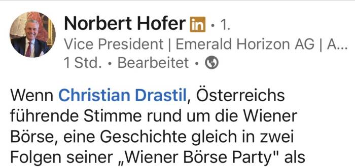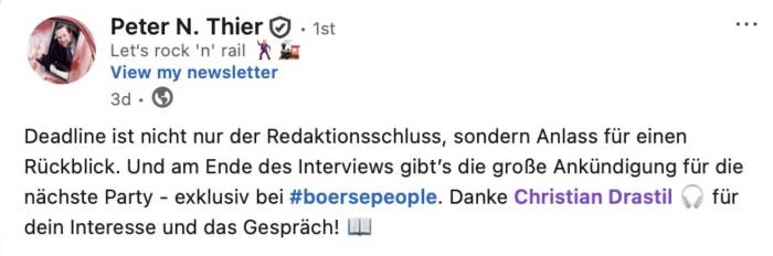 Es ist möglich, aus den Börsenradio-Vorstandsinterviews und den Börsepeople-Talks eine Doppelseite Print im Layout des boerse-social.com/magazine machen zu lassen. Unkostenbeitrag 500 Euro zggl. Steuern, man bekommt das PDF zur eigenen Verwendung, zB für Pressespiegel, Social Media oder Ähnliches. Den Abdruck der Doppelseite im jeweils nächsten Börse Social Magazine bieten wir zu weiteren 500 Euro zzgl. Steuern Selbstkostenpreis an. Infos unter christian.drastil@boerse-social.com.