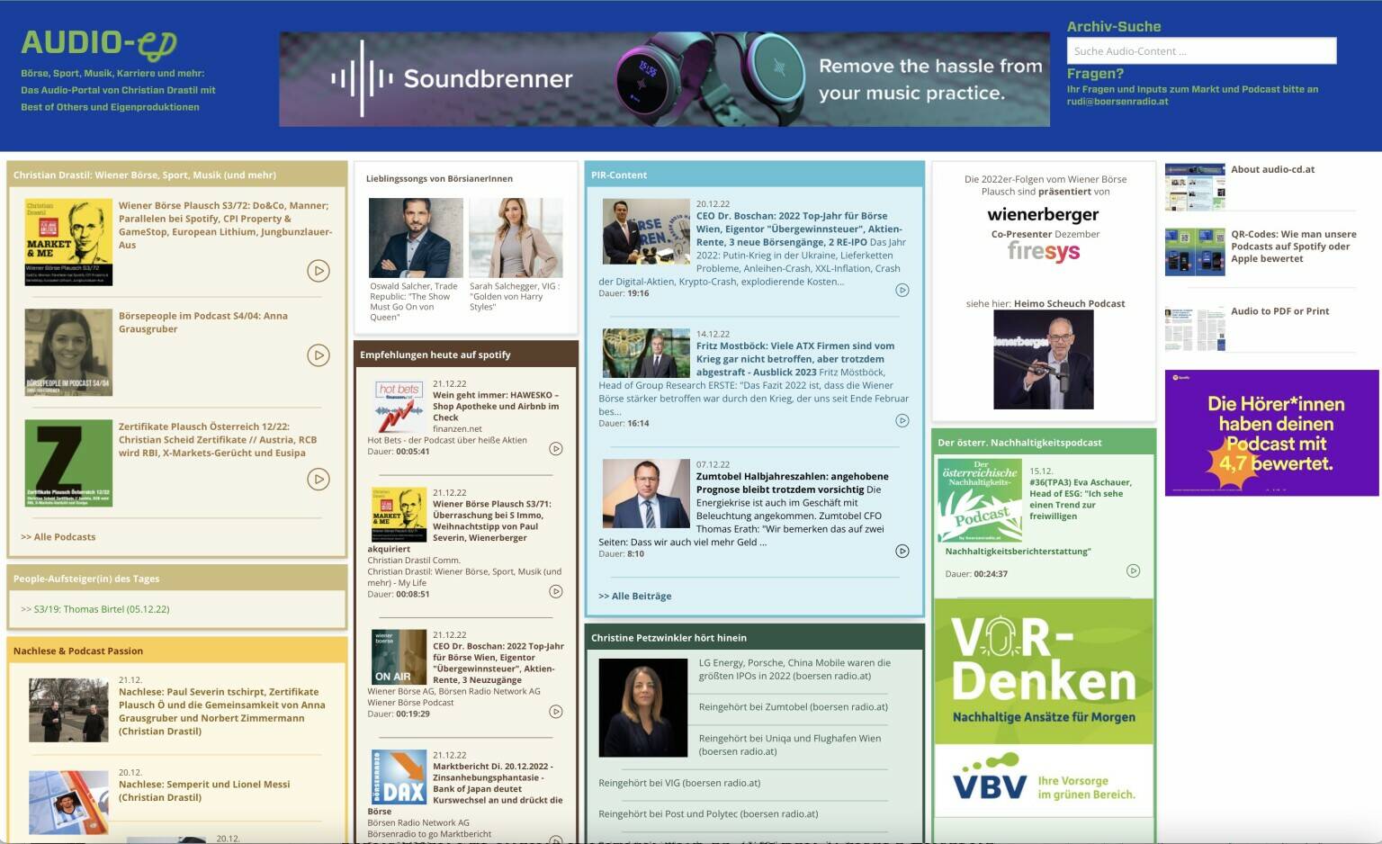 Website. Die begleitende Website audio-cd.at soll zum Independent Audio Financial Literacy Portal werden, wir teasern eigene Podcasts an, aber auch fremde und kooperieren mit allen, die Lust dazu haben. Werbepartner gesucht und ebenfalls willkommen. Podcasts sind die Zukunft! Danke an die zahlreichen Supporter 2022 und bitte den Podcast bewerten! -