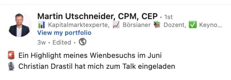 About: Die Serie Börsepeople findet im Rahmen von http://www.christian-drastil.com/podcast statt. Es handelt sich dabei um typische Personality- und Werdegang-Gespräche. Die Season 3 umfasst unter dem Motto „22 Börsepeople“ erneut 22 Podcast-Talks, divers zusammengesetzt. Presenter der Season 3 ist der Börsekandidat VAS AG ( https://www.vas.co.at). Der meistgehörte Börsepeople Podcast 2022 per Stichtag 30.11., 23:59 Uhr wird es einen Number One Award für 2022 gewinnen (vgl. https://boerse-social.com/numberone/2021)- Zwischenstand tagesaktuell um 12 Uhr aktualisiert unter http://www.audio-cd.at/people .