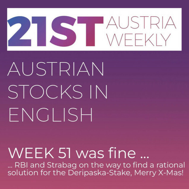 The following script is based on our 21st Austria weekly and Week 51 was again a good week for ATX TR, which climbed 1,08 percent. Topperformers RBI and Strabag are on the way to find a rational solution for the Deripaska-Stake in Strabag. Further news came from Marinomed, Austrian Post, UBM, Kapsch TrafficCom, Andritz, RBI, A1 Group, Valneva, Immofinanz and CA Immo, spoken by the absolutely smart Alison.