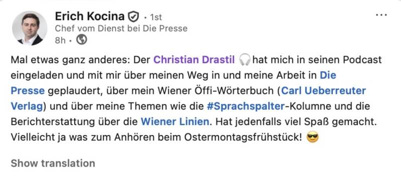 Christoph Weißenbäck, mein Co. beim Bezirkspodcast Alsercast, war früher Vorstand der NÖM International, arbeitete u.a. für Erwin Hameseder.