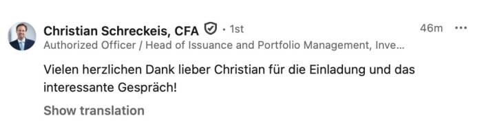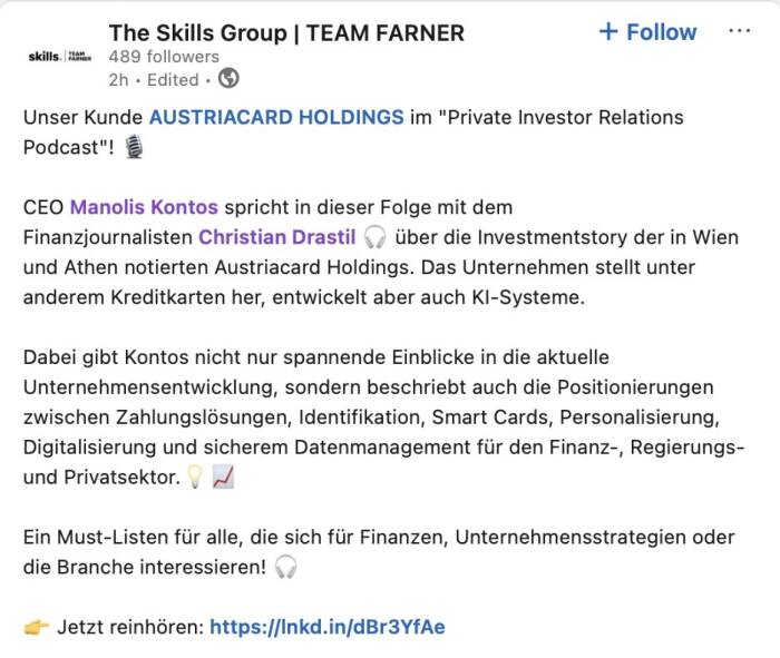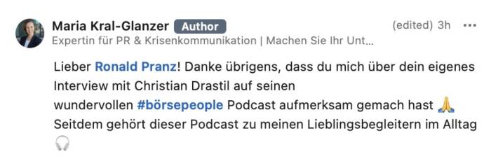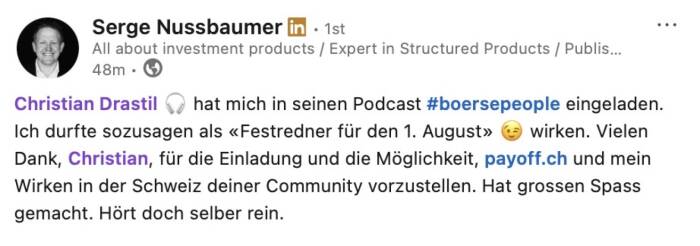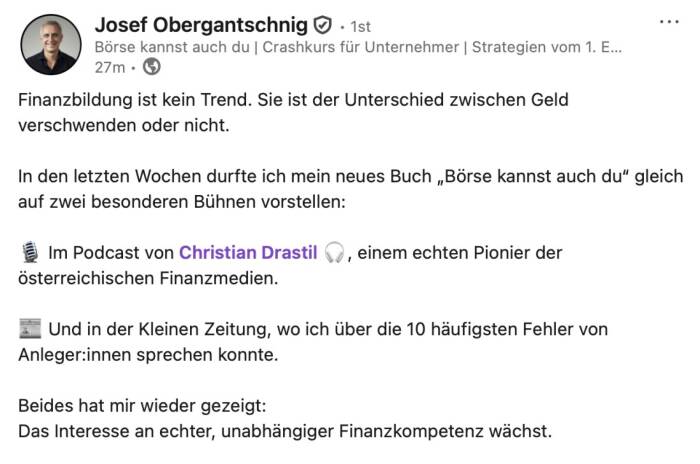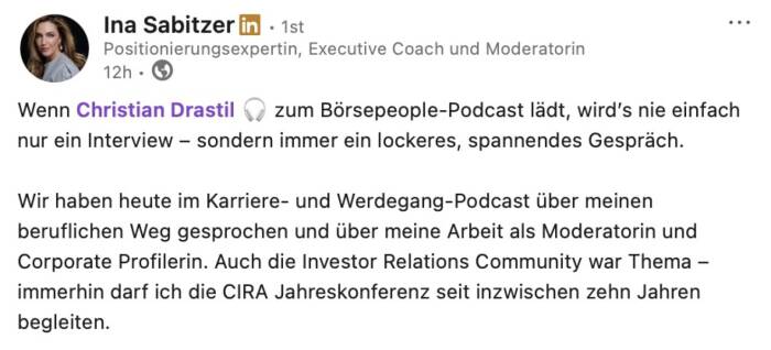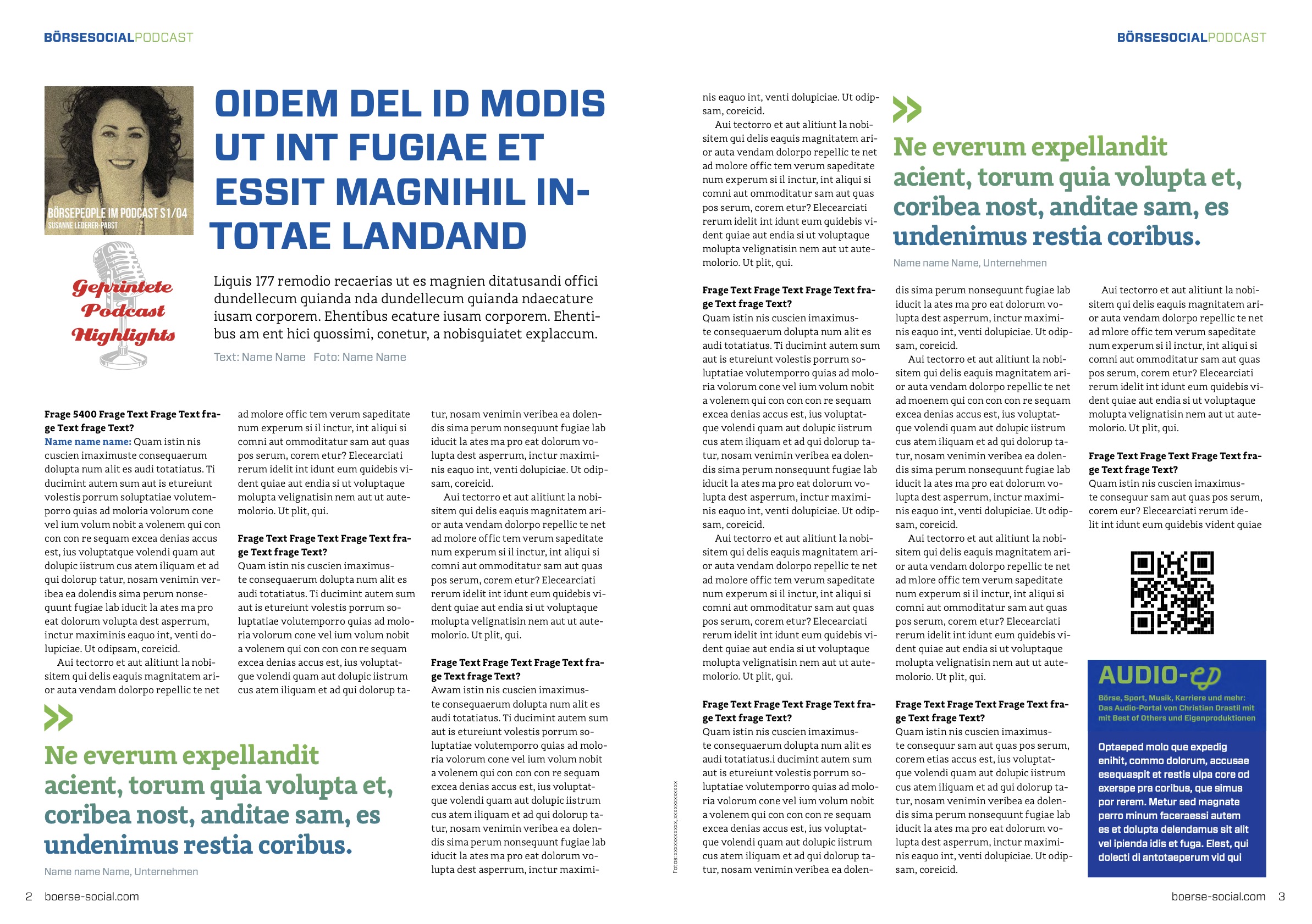 Es ist möglich, aus den Börsenradio-Vorstandsinterviews und den Börsepeople-Talks eine Doppelseite Print im Layout des boerse-social.com/magazine machen zu lassen. Unkostenbeitrag 500 Euro zggl. Steuern, man bekommt das PDF zur eigenen Verwendung, zB für Pressespiegel, Social Media oder Ähnliches. Den Abdruck der Doppelseite im jeweils nächsten Börse Social Magazine bieten wir zu weiteren 500 Euro zzgl. Steuern Selbstkostenpreis an. Infos unter christian.drastil@boerse-social.com.