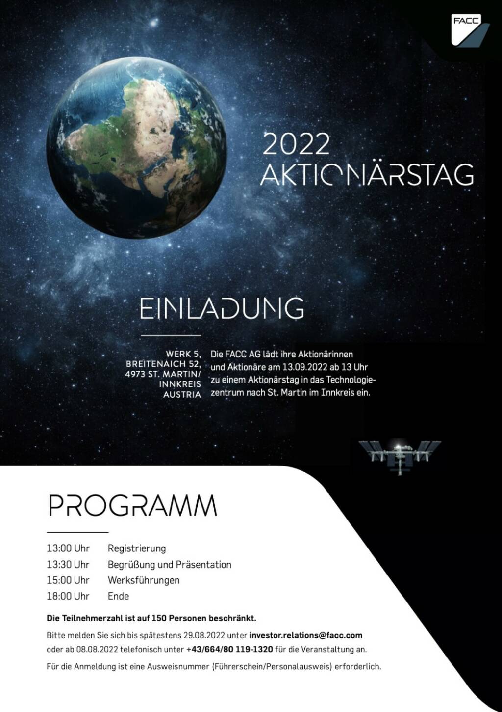 FACC lädt die Podcast Hörer:innen zum Aktionärstag am 13.9. ein.