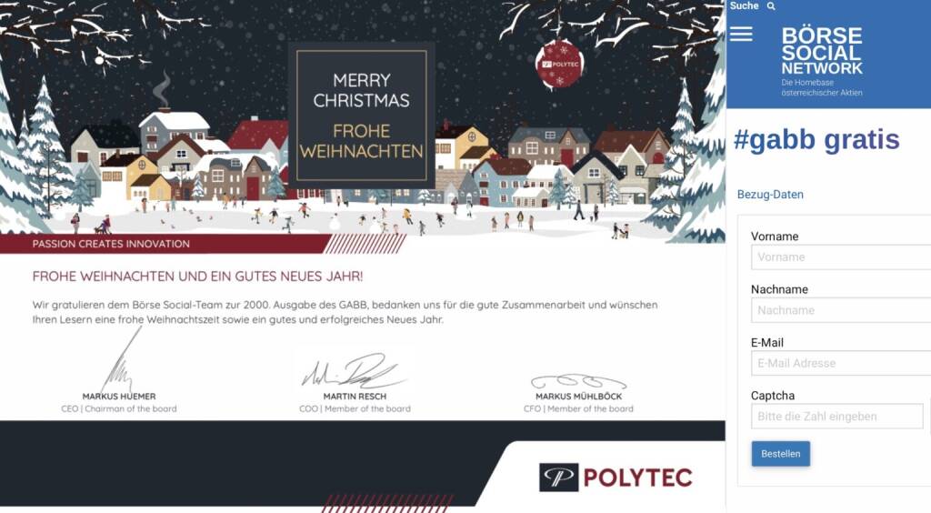 Heute Mittag erscheint bereits Ausgabe 2000 unseres Börsenbriefs #gabb, in den vergangenen rund 8 Jahren haben wir keinen Handelstag mit dem #gabb ausgelassen, nicht wenn Feiertag war, nicht, wenn die Pandamie uns schockte. Danke an die Community für den guten Austausch rund um dieses Produkt, hervorheben möchte ich Paul Rettenbacher von Polytec und ein Dank auch an die Polytec-Vorstände für die Gratulation an uns und natürlich die Best Wishes an alle. Das bringen wir gerne auf Seite 1 heute! Und: Weil die Wiener Börse gut läuft, haben wir uns entschlossen, den #gabb gratis verfügbar zu lassen, hier kann man sich anmelden: https://boerse-social.com/gabb